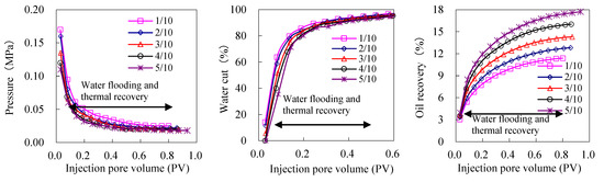 The influence of the swept areas on the thermal recovery was investigated by saturating the cores using oil with a low viscosity (57.0 mPa·s) to simulate the oil viscosity at 100 °C in the swept areas. The oil viscosity in the unswept areas was 590 mPa·s. The swept areas were set as 1/10, 2/10, 3/10, 4/10, and 5/10 of the injector–producer distance from the producer outlet. The oil recovery results are summarized in Table 4 and the experimental dynamic characteristics are shown in Figure 8.