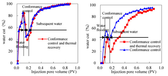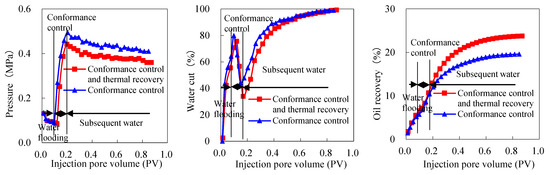 Figure 8 shows that as the swept area of the thermal fluid increased, the flow resistance and injection pressure decreased and the water cut increased more gradually, resulting in higher oil recovery associated with water flooding.