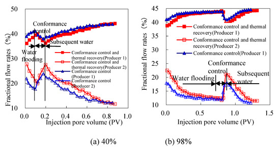 Relationships between fractional flow rates of Producers 1 and 2 and injection pore volume when profile control was performed at water cuts of 40% and 98%.