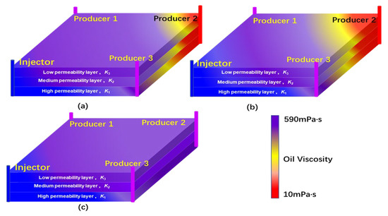 As can be seen in Table 6, compared with water flooding, the development effects of water flooding and thermal recovery as well as water flooding and profile control were superior, with incremental oil recoveries of 2.7% and 5.3%, respectively. Among the three development methods, the integrated implementation of profile control and thermal recovery resulted in a synergistic effect with a higher incremental oil recovery (9.4%) than the total oil recovery (8.0%) of both profile control (5.3%) and thermal recovery (2.7%). In addition, the implementation timing of profile control affected the oil recovery: The oil-increasing effect at the water cut of 40% was superior to that at a water cut of 98%. Figure 11 and Figure 12 show that the oil recoveries of profile control and thermal recovery were higher than that of profile control. In the water flooding stage, the productivity and water-cut rising speed of Producer 2 were lower than those of Producer 1. After profile control and thermal recovery, the fractional flow rate of Producer 2 increased, as shown in Figure 13, Figure 14 and Figure 15. The synergistic effect was attributable to the higher vertical and horizontal sweep efficiencies after profile control at lower oil viscosities with thermal recovery. The injected water primarily entered the high-permeability layer along with adjacent wells and Producers 1 and 3 (Figure 16a), resulting in a rapid increase of the water cut. After profile control was implemented, the inorganic gels plugged the preferential flow paths to the high-permeability layer and directions to Producers 1 and 3, as shown in Figure 16c. At low oil viscosities with thermal recovery, after profile control more injected water flowed into the lower-permeability layer near Producer 2, as shown in Figure 16b. Additionally, more injected water flowed toward Producer 2 than toward Producers 1 and 3. The increased swept volume in the area with lower oil viscosity ensured that the oil recovery was higher than the total oil recovery of profile control and thermal recovery [39].