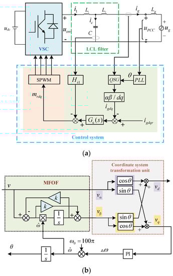 Structure and model of single-phase grid-connected inverter: (a) the control block diagram of the single-phase LCL-type grid-connected inverter; (b) the control diagram of MFOF-PLL.