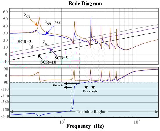 To facilitate the analysis, a single-phase GCI with a rated power of 5 kW is used for further illustration. When the short-circuit ratio (SCR) is taken as 3, 5 and 10, respectively, the corresponding grid equivalent inductance Lg is 10 mH, 6 mH and 3 mH, respectively. The bode plot of the inverter impedance, with and without considering MFOF-PLL, can be obtained from Equation (7) as shown in Figure 3, where Zqq_PLL denotes the inverter impedance considering MFOF-PLL and Zqq denotes the inverter impedance without considering MFOF-PLL. The parameter design method of the current controller proposed in [] is referenced in this paper, which enables the stability margin to be always larger than 20° at the intersection frequency band between inverter and grid impedance, when the influence of MFOF-PLL is ignored.