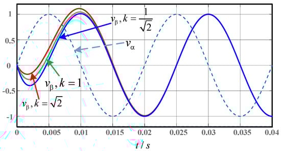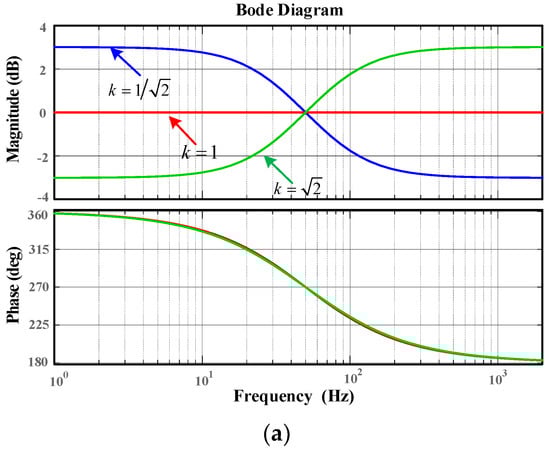 where, is the output angular frequency of PLL. When the angular frequency of the grid voltage is equal to , the output signal of the MFOF-PLL is a pair of quadrature signals with equal amplitude and 90° phase difference. Figure 4 shows the dynamic response curve of Q(s) for different values of k in Equation (9), and it can be observed that the dynamic response of the MFOF-PLL is almost consistent when k changes.