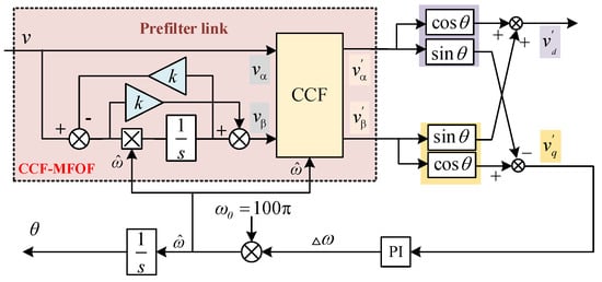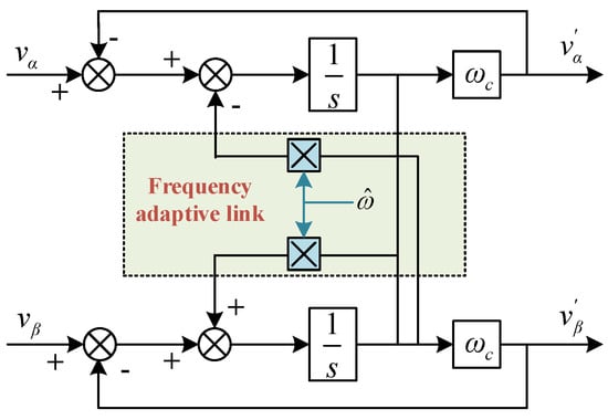 In the weak grid, the intersection frequency of the magnitude–frequency characteristic curve between the inverter impedance and grid impedance is usually in the range of several hundred Hz. In order to suppress the influence of the additional term brought by PLL on the stability of the inverter, the PLL needs to have the ability to adequately attenuate the signal in the range of at least 100–600 Hz. Therefore, a modified first-order filter PLL with complex coefficient filter (CCF-MFOF-PLL) is proposed in this paper as shown in Figure 5. The complex coefficient filter (CCF) shows amplitude attenuation characteristics in the intersection frequency band of magnitude–frequency characteristic curve between the inverter impedance and grid impedance. Therefore, the adverse influence brought by MFOF-PLL can be effectively suppressed by using the CCF as a prefilter link.