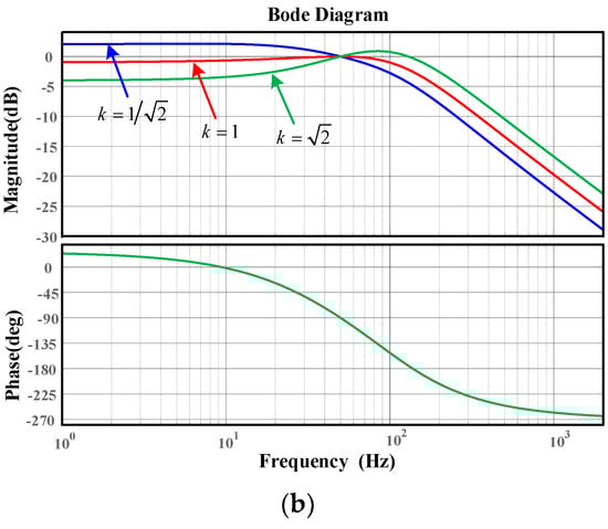 It can be found from references [,] that for MFOF-PLL, the value range of k is usually chosen to be . At this time, the value range of is according to Equation (13). In order to lower the order of , is chosen to be equal to . Then, zero-pole pair elimination can be achieved in (14) and the value range of can be obtained, which is . Then Equation (14) can be simplified as: