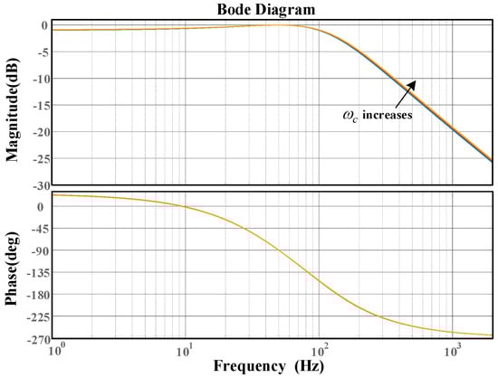 Figure 9 shows the bode plot of with the change in , where increases from 628.32 to 666.44. It can be observed that the bode plot of changes less when is varied within the chosen range. At this time, CCF-MFOF-PLL can maintain strong harmonic rejection capability, which proves the reasonableness of the above simplification.