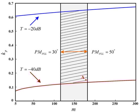 where, is the 6th harmonic angle frequency. Considering the value range of T as [−20, −40] dB, the relationship curve between kp and m can be obtained as shown in Figure 11.