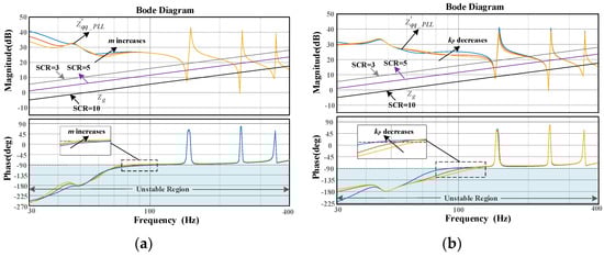 In order to analyze the effect of m and kp on the inverter, the bode plot of with the change in m and kp is shown as Figure 12. It can be observed from Figure 12a that when m changes and kp is constant, the stability domain of the inverter-grid interconnection system is further expanded in low-frequency band with increasing m. Similarly, it can be observed from Figure 12b that when kp changes and m is constant, the phase of in low-frequency band increases with decreasing kp and the stability domain of the inverter-grid interconnection system also is expanded. Moreover, comparing Figure 12a,b, the effect of kp on the inverter output characteristic in the weak grid is greater than that of m. In summary, the grid-connected system can maintain a wider stability range with the larger m and smaller kp in the constraint region of Figure 11. Therefore, combining with the above analysis, point A in Figure 11 is chosen. According to Equation (20), ki = 3.94 can be obtained when kp = 0.15 and m = 175 are chosen.