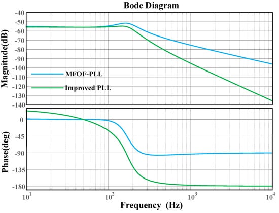 The inverter impedance can be reshaped by using proposed CCF-MFOF-PLL. At this time, the equivalent transfer function of PLL is modified by multiplying Gccf(s) before the original HPLLig(s) and HPLLm(s). In order to analyze the improvement effect of CCF-MFOF-PLL on the inverter stability, the transfer function from to is discussed as an example. Figure 13 shows the bode plot of the transfer function from to before and after the improvement. It can be observed that due to the addition of CCF, the MFOF-PLL has the stronger amplitude attenuation ability in the frequency band above 100 Hz. At this time, the additional term brought by MFOF-PLL in the inverter impedance denominator can be considered as a negligible factor, which proves that the proposed impedance reshaping method based CCF-MFOF-PLL can suppress the adverse influence brought by MFOF-PLL on inverter stability.