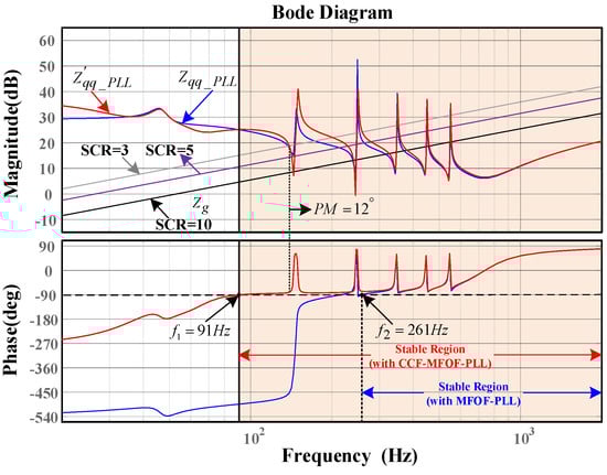 The bode plot of the inverter and grid impedance after impedance reshaping is shown in Figure 14. It can be observed that the instability risk of the inverter is significantly reduced after using CCF-MFOF-PLL in the weak grid. The proposed CCF-MFOF-PLL raises the phase of the inverter impedance in low-frequency band, thus expanding the stability domain of the inverter. It can be observed from Figure 14 that the stable frequency band of the inverter-grid interconnection system is enlarged from f2 > 261 Hz to f1 > 91 Hz. In addition, the inverter has a stability margin of 12° even when SCR = 3 after impedance reshaping. In other words, even if the SCR is dropped to 3 or lower, the inverter can still maintain the strong robustness.