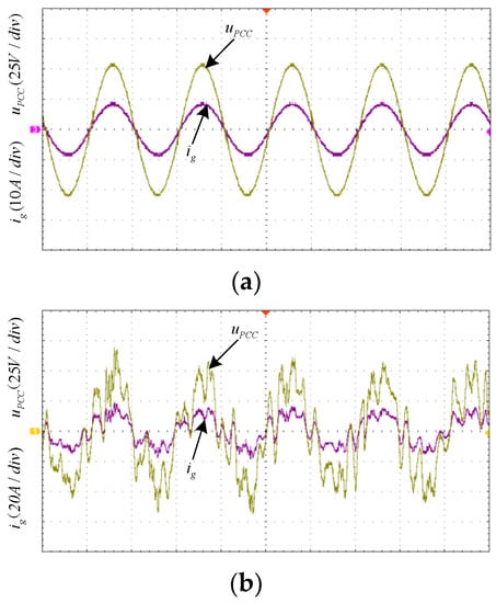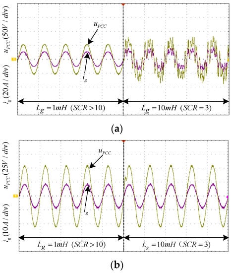 Experimental waveform of current and voltage at PCC for different SCR after impedance reshaping: (a) Lg = 0 (SCR > 10); (b) Lg = 10 mH (SCR = 3).