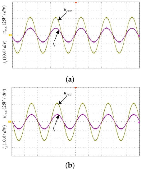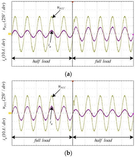 Subsequently, to verify the dynamic performance of the proposed control method, the experimental waveform of the current and voltage at PCC when the reference current changes abruptly is shown in Figure 18. It can be observed that after impedance reshaping, the inverter can operate stably when the reference current is set either from half load to full load, or from full load to half load. At the same time, the inverter can enter the stable state within 0.005 s at the instant of reference current jump, and the dynamic response of the system is fast, thus verifying that the proposed method can effectively solve the problem of system robustness degradation and oscillation instability caused by MFOF-PLL in the weak grid.