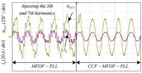 Finally, to verify the effectiveness of the proposed control method under the harmonic grid, Figure 20 shows the experimental waveform of current and voltage at PCC after injecting harmonic voltage, in which the 5th and 7th harmonic content of both are 0.1 pu, and Lg is set to 10 mH. It can be observed that when switching the PLL from MFOF-PLL to CCF-MFOF-PLL, the inverter can resume stable operation and the THD of current at PCC is 2.62% at this time, which meets the grid-connected standard. The above analysis indicates that the proposed impedance reshaping method is still highly adaptable even under the harmonic grid.