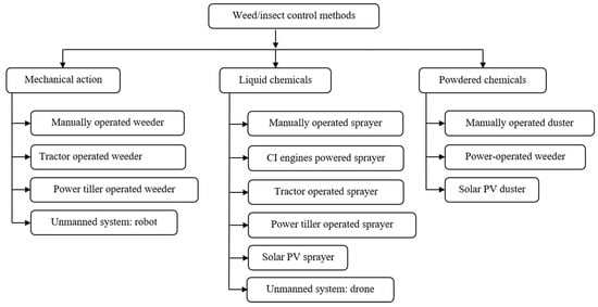 The management of these harmful organisms is essential to maintain crop hygiene and prevent losses in crop yield. Farmers mainly adopt synthetic chemical molecules to control weeds, insect pests, and diseases. Different methods employed for weed/insect management in agriculture are depicted in Figure 1.