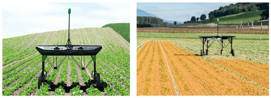 The unmanned system (robot) is well suited for weeding operations, and it helps to minimize the required workforce and herbicide usage while weeding. Two solar-powered weeders, EcoRobot and AVO robot models, are developed by Ecorobotix, Switzerland (Figure 2). These models work more effectively in row crops based on the detection of weeds (>85%), and a micro-dose of herbicides is applied precisely on the weeds to destroy them. The solar power used in EcoRobot and AVO models is 380 W and 1150 W, respectively, and they have a working time of 8 and 12 h once fully charged by solar panels [64].