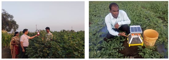 Spraying is an operation of spreading fine droplets of liquid chemicals over plant canopy to protect them from pests and diseases. For this purpose, many versions of manual or power-operated (engine, battery, tractor, and power tiller) spraying equipment are used. Backpack, trolley type, and wheel-supported solar-powered sprayers are used as alternatives to conventional sprayers (Table 3). Solar PV sprayers consist of solar panels, rechargeable batteries, DC motors with a pump or a spinning disk, a chemical tank, wheels/support frame (based on types), a spray lance, and accessories. Solar panels are fitted in most of the sprayers for easy recharging. In the case of backpack sprayers, depending on the models, the power output from the solar panel varies in the range of 5 to 75 W. A solar-powered knapsack sprayer has a solar panel of 20 W, a 12 V and 7.5 Ah battery, a 12 V DC motor with a pump, a spraying tank, a frame, an adapter, and a connector output for multiple applications (radio, mobile charging, lighting, etc.). These kinds of sprayers are used for different crops such as cotton, red gram, and vegetables such as onion (Figure 4). The operation cost of solar-powered sprayers is INR 53.75, which is lower than battery-powered (INR 78.75) and manually operated (INR 102.5) sprayers.