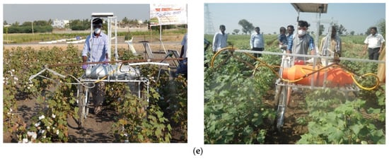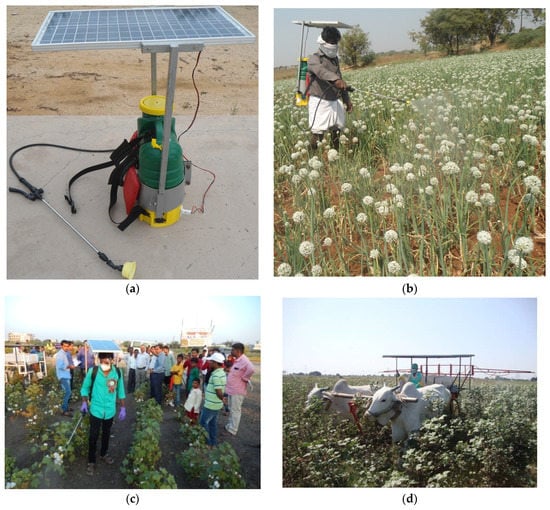 Different types of solar-powered sprayers. (a) Solar-powered knapsack sprayer; (b) utilization of solar-powered knapsack sprayer in onion field; (c) utilization of solar-powered knapsack sprayer in cotton field; (d) utilization of bullock-drawn solar-powered high-clearance sprayer in cotton field; (e) utilization of solar-powered push-type sprayer in cotton field.