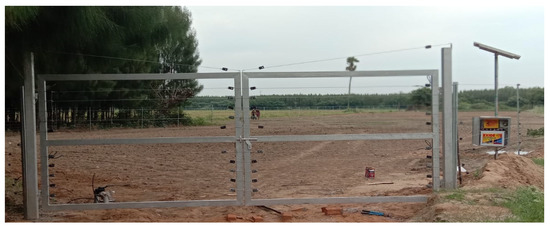 In remote areas, electric fencing is a proven technology to protect and safeguard fields from animals. Farmers may fail to protect their farms from animal attacks mainly due to the non-availability of electricity/absence of power grids. A PV electric fence is an alternative to the existing electric fence system and is well suited for off-grid areas. It is the most effective and economical approach for long-term operations in unelectrified areas. Solar PV fencing systems can fulfill farmers’ requirements to protect their crops (Figure 5). The components of the solar fencing system are solar panels, an energizer or a controller, a rechargeable battery, a main post, a fence wire supporting post, a t-post, a lightning diverter and choke kit, a super-earth kit, a super strain insulator, a permanent wire tightener, a chain wire strainer, tension springs, a double insulated lead-out cable, joint clamps, gateway and gates, cut out switches, electrified flood gates, live light, and a fence voltage alarm [134]. The current from the battery is supplied to the energizer to produce a high voltage with a low current in the fencing wires. Animals touching the fence wires experience a minimal electric shock which makes them leave the field. The fencing system would not cause any fatalities or injuries to animals/humans due to the low current supplied from the solar PV system. Kadam et al. [134] found that a combination of a solar panel (35 kW) and battery (12 V) was sufficient to effectively cover a 3.5 km fence line, which costs about USD 3300/km. In Kenya, 121 km of solar fencing was established to protect fields from elephant attacks in the West Laikipia area. The fencing system was arranged with 10 m spacing for fencing posts to support five fencing wires and 5 km spacing for an energizer house cum solar panels to produce 7 kV power [135]. Most solar PV-based fencing systems installed in South Africa were due to reduced costs compared to conventional fencing systems [136].