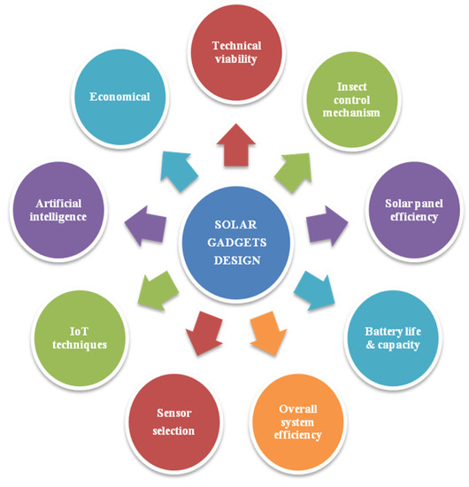 Generally, plant protection involves management strategies for controlling insect pests, diseases, birds, and other biological stresses during crop cultivation. The concept of integrated pest management (IPM) involves cultural, physical, mechanical, behavioral, biological, and chemical methods. Among the current strategies, the chemical method is the most viable, effective, and readily available option in the crop production system. In many countries, synthetic pesticides are primarily used to control pests. However, improper use of synthetic chemical molecules directly affects agro-horticultural ecosystems and the environment, and they also contaminate harvested farm produce. Nowadays, chemical pesticides develop resistance in insects and pathogens, forcing farmers to use higher quantities and indiscriminate pesticides. Overuse of pesticides poses a high risk to the public who consume these products with residual pesticides and affects the existing natural environment [10]. Non-optimal use of pesticides leads to resistance and resurgence development in pests and diversity loss in the natural environment [11,12]. The management of insect pests has become one of the biggest challenges for organic cultivation, making new, eco-friendly alternative management strategies a timely need to combat the problems. Physical methods include electric and bait traps, which have received a great deal of attention worldwide [12,13]. Farmers are more interested in implementing eco-friendly pest management strategies and handling plant health management techniques at the right time during crop production. The preference is for management strategies and the delivery system or mode of implementing these methods. The utilization of eco-friendly energy sources might be the most preferred operating tool in plant protection if options are many. However, eco-friendly energies for various plant protection operations are a newer dimension of agriculture and organic farming. According to an FAO (2000) survey, 35 percent of solar energy is utilized in agricultural activities such as irrigation, livestock watering, and electric fencing. Only 2 percent is used for operating the sprayers, whereas power consumption for solar fencing protection against grazing animals is 14 percent.