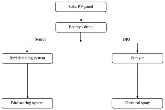 Figure 7. An integrated approach: solar-powered drone for bird scaring and spraying operations. - The Internet of Things (IoT) has a potential purpose in agriculture, which would help in increasing the efficiency of agricultural production processes [139]. Applications of IoT technologies can modify existing agricultural practices [140]. Furthermore, IoT-supported automation of solar-powered plant protection equipment will reduce labor requirements with improved crop yield, which would lead to smart health monitoring in agriculture.