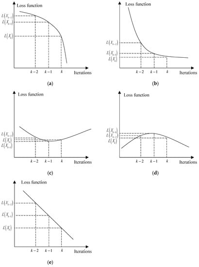 Diagram of typical local optimization scenes: (a) Local rapid descent scenario; (b) local slow descent scenario; (c) local concave oscillation scenario; (d) local convex oscillation scenario; (e) local uniform descent scenario.