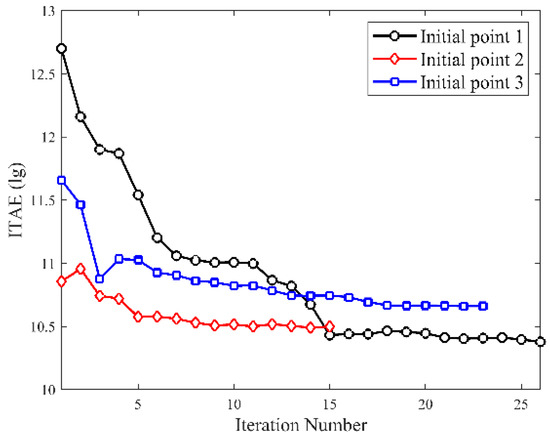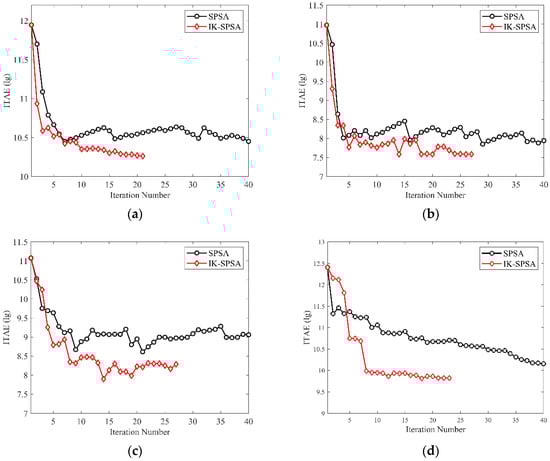 From Figure 12, with the advancement of the optimization process, the ITAE index continues to drop significantly, which also means that the control system’s performance has been significantly improved. Moreover, the whole optimization process only needs more than 20 times iterations, which means that IK-SPSA can achieve the optimization goal in a limited number of times and IK-SPSA can realize intelligent iteration termination, avoiding unnecessary iteration cost waste. Figure 12 shows that IK-SPSA has certain advantages over SPSA. IK-SPSA can find the optimal value faster, which verifies the effectiveness of the improved mechanism to a certain extent.