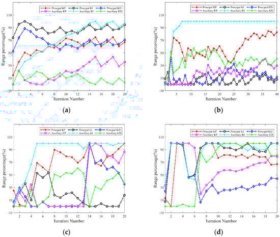 According to the characteristics of the IK-SPSA optimization strategy, the control system parameters will be improved in parallel with the progress of iterative optimization. The change of these key controller parameters is accompanied by the continuous improvement of control system performance. The trajectories of the controller parameters can be observed in Figure 14. It can be found that with the advancement of the optimization process, the six key controller parameters will undergo random parallel perturbation and continuous dynamic change.