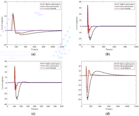 When the iteration termination control conditions are met, the optimization method terminates in time and finds an optimal control parameter point. To show the change in the control system performance before and after the optimization process and to prove the effectiveness of the optimization method, Figure 15 draws the transient response curves of the control system water level at the initial point and the optimal working parameter point during the optimization process. The dotted line is the water level target setting value. The solid line curve is the water level curve before optimization. The dotted line is the water level curve after optimization. Compared with the control system before optimization, the maximum deviation of the optimized control system under different power is reduced by 2%, 3.2%, 2.1%, and 27%, respectively. The peak time is reduced by 4.7%, 10%, 9.8%, and 34%, respectively; The transient time is reduced by 50%, 60%, 75%, and 71%, respectively. The response performance of the optimized control system is greatly improved, which also reflects the effectiveness of the IK-SPSA method.