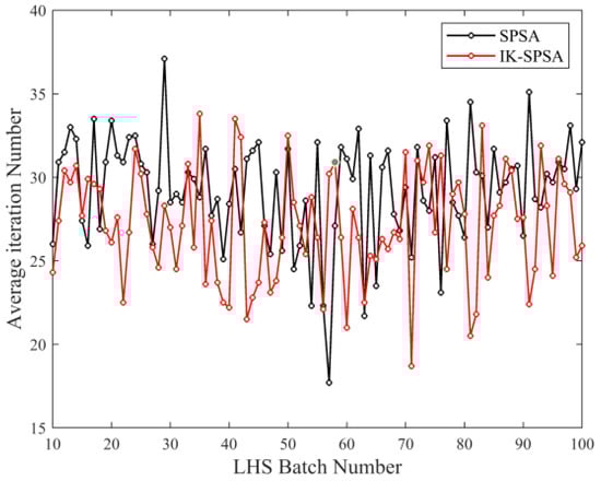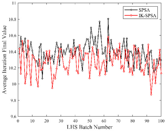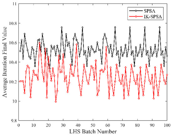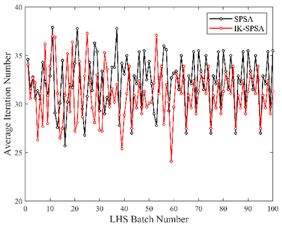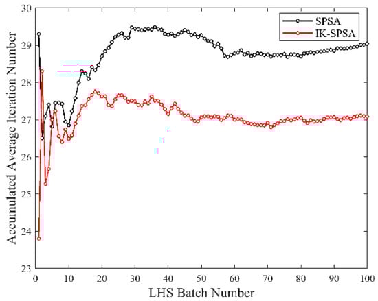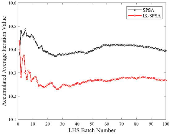 Sequential Latin square experimental design can provide trend trajectories analysis perspective to optimize the dynamic change of performance. Figure 21 and Figure 22 show the dynamic change track of the accumulated average iteration times of IK-SPSA. With the advance of sequential Latin square batches, in the initial status, the average iteration times may deviate significantly from the statistical values because the number of experimental samples is insufficient. With the proceeding of Latin hypercube sampling (LHS) batches, the number of samples covered increases gradually. Correspondingly, the cumulative performance indices converged to a stable value gradually. The average performance in the feasible region could exhibit convergence characteristics under the cumulative effect, and the variability in the performance of the methods is thus eliminated. This could reveal the relative performance between the two methods. Through 1000 groups of experiments, under the same initial point and different initial points, the average iteration times of IK-SPSA are 31 and 27, respectively, and the average iteration times of SPSA are 32.2 and 29, respectively. Compared with the typical SPSA method, the iteration times of IK-SPSA strategy are reduced by 3.7% and 6.9%, respectively. When compared to the typical SPSA approach, the iteration times of the IK-SPSA strategy are shorter.