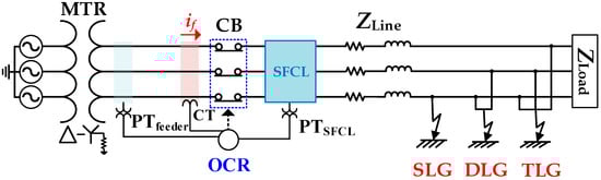 Though the SFCL effectively controls the fault current, the SFCL obstructs the activation of the OCR. The OCR has inverse characteristics for the fault current, so the trip time of the OCR is delayed as the fault current decreases due to the SFCL. The trip delay problem of the OCR (due to the fault current limiting operation of the SFCL) has been found, in many previous studies, to be resolved by resetting the characteristic equation of the OCR using the current or voltage components. However, these previous reports only deal with balanced ground fault situations and may cause malfunction in unbalanced ground faults, since the fault current is different in each ground fault. All ground types of faults must be considered because unbalanced ground fault such as single-line and double-line ground faults (SLG, DLG) occur more than balanced ground faults such as triple-line ground faults (TLG) [,,,,,,,,,,,,].