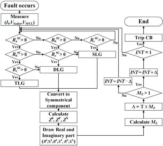 The flowchart of the impedance compensation method with the OCR operational algorithm is shown in Figure 3. The ground fault type is determined by measuring the resistance occurrence of HTSC element in each phase. After that, MZ is calculated using the sequence components of the feeder voltages, the SFCL voltages and the feeder currents. MZ is progressed with the operating characteristic of the OCR (10).