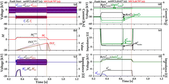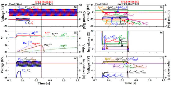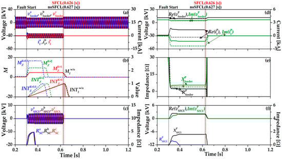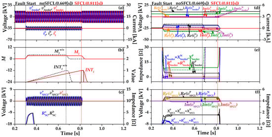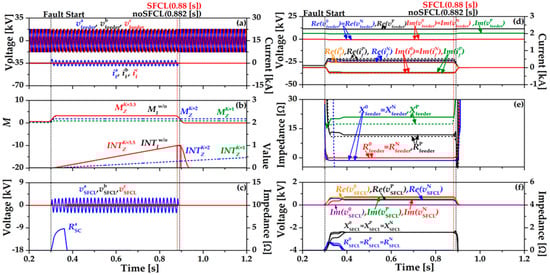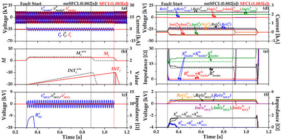 Figure 5 shows the single-line ground fault (SLG) in a phase to ground using the impedance compensation method (17). In Figure 5b, the operation of OCR using (17) is expressed in the integration value INTZ, which has three different waveforms depending on K values (1, 2, 3.5). When K = 3.5, the index value (MZ) and INTZ are most similar to the existing OCR algorithm (2) without SFCL (INTw/oI). OCR operates at 0.88 [s] and decreased by 0.002 [s] compared to the existing OCR algorithm (2) with SFCL. In Figure 5c, resistance of the HTSC element (RaSC) is the same as Figure 4 since the breaker operation of the SFCL is constant as the critical current (IC) is maintained. During the fault time, the voltage of the SFCL (vSFCL) is reduced by RaSC and increased again since the direction of the fault current changes to the current limiting reactor (CLR). Figure 5d shows the sequence components’ waveforms of the feeder voltages and currents. The dotted line is the feeder voltages and currents using existing OCR algorithm (2) without the SFCL and the solid line is the impedance compensation method (17) with the SFCL. The zero and negative sequence feeder voltages are almost the same. Figure 5e is the sequence components’ waveforms of feeder impedance. The dotted line is the feeder impedances using the existing OCR algorithm (2) without the SFCL and the solid line is the feeder impedances using the impedance compensation method (17) with the SFCL. Figure 5f is the sequence component waveforms of the SFCL voltages and impedances.