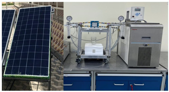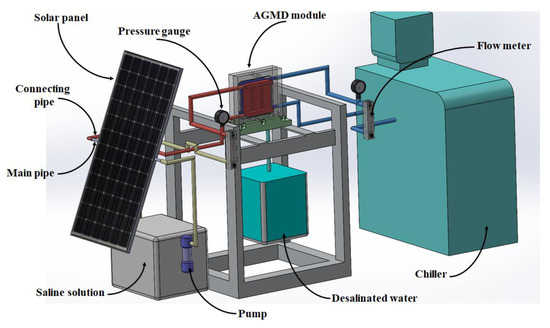 The designed and developed experimental setup used in the study is shown in Figure 5. The key components of the experimental setup were the (i) air gap membrane module, (ii) water chiller, and (iii) solar PV panel integrated with a passive water-cooling system.