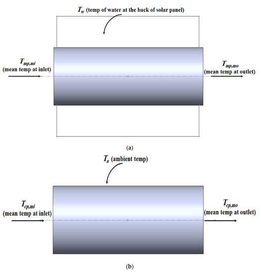 The temperature of the hot water surrounding the main pipe is “” and temperature of the ambient air surrounding the connecting pipe is “”. The mean inlet temperatures for main and connecting pipes are “” and “”, respectively. Similarly, the mean outlet temperatures for the main and connecting pipes are “” and “”, respectively, Figure 3. The temperature differences for the main and connecting pipes are defined as