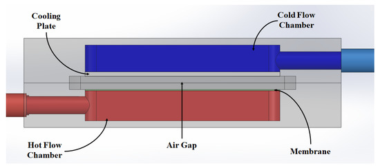 Different sections of the proposed AGMD module are shown in Figure 4, which are the (i) hot flow chamber, (ii) membrane layer, (iii) air gap, (iv) cooling plate, and (v) cold flow chamber.