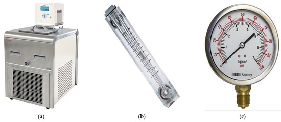 (a) Chiller with a built-in pump, (b) flow meters (Omega FL 50,000), and (c) Baumer pressure gauges.