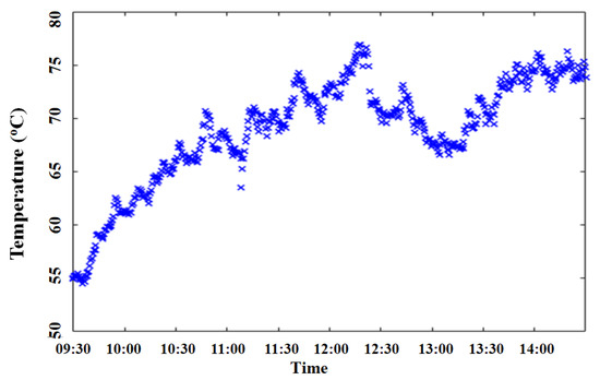 The hourly global solar radiation and ambient temperature on 12 April 2021, in the city of Dammam are shown in Figure 7. The ambient temperature was observed to remain above 30 °C during the period of 10 am to 3 pm. The measured surface temperature of the solar panel crossed the 75 °C mark during the same period (Figure 8).