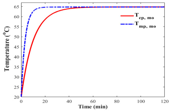 The mean temperatures of the hot saline at the outlet of the main and connecting pipes are shown in Figure 9. The temperature of the water (Tw) at the back of the solar panel surrounding the main pipe was 70 °C. To account for the heat losses from the connecting pipe, the ambient temperature (Ta) in the numerical solution was kept at 35 °C. The effect of the heat losses from the connecting pipe was quite obvious in terms of the time taken to reach the steady temperature.
