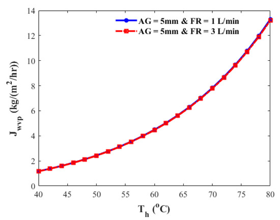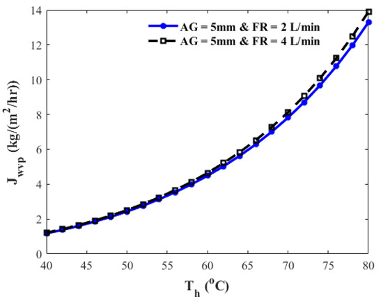 Effect of the hot feed (FR = 2 and 4 L/min) on the permeate (Jwvp) at different hot feed temperatures (Th) (air gap thickness (AG) of 5 mm).