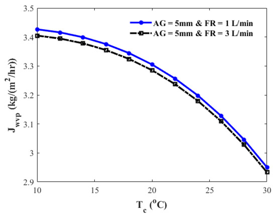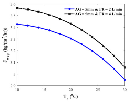 The effect of the hot feed temperature on the Jwvp at a constant cold feed temperature (20 °C) and fixed air gap thickness (5 mm) is presented in Figure 10. It is evident that when the hot feed temperature increased, the permeate increased. Increasing the feed of the hot solution from 2 L/min to 4 L/min produce a slim increase in the permeate corresponding to the hot feed temperature above 60 °C. Similarly, the effect of the cold feed temperature on the permeate at a constant hot feed temperature (55 °C) and fixed air gap thickness (5 mm) is presented in Figure 11. As expected, when the cold feed temperature increased, the permeate decreased. A visible rise in the permeate was obtained by boosting the hot feed rate from 2 L/min to 4 L/min.
