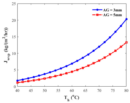 Effect of the air gap thickness (AG = 3 and 5 mm) on the Jwvp at different hot feed temperatures (Th) (hot feed of 2 L/min and cold feed of 1 L/min).