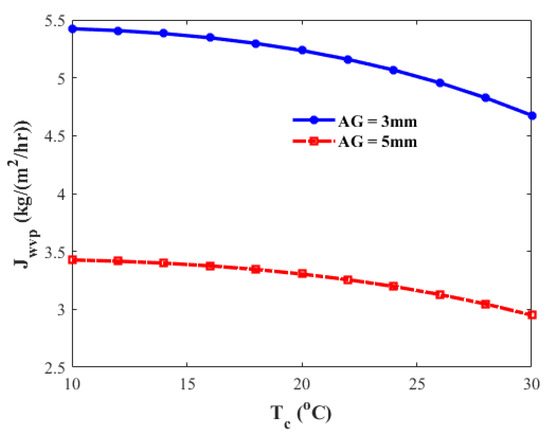 Effect of the air gap thickness (AG = 3 and 5 mm) on the Jwvp at different cold feed temperatures (Tc) (hot feed of 2 L/min and cold feed of 1 L/min).