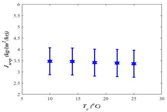 where Mc is the mass transfer coefficient, is the vapor pressure on the feeding side of the membrane, and is the vapor pressure on the condensing side of the membrane. Substituting the overall mass transfer coefficient (Mc) into Equation (17), a simplified equation of the water vapor permeate flux is given as