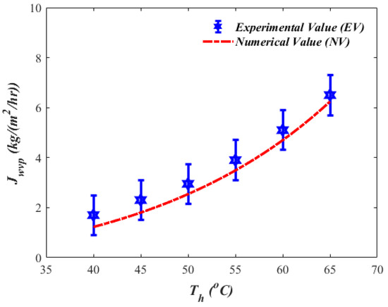 The hot feed was kept at 4 L/min, while the cold feed was kept at 1 L/min. The experimental results were found to be in accord with the numerical results presented in the earlier section. Increasing the hot feed temperature resulted in an increase in the permeate (Figure 16) and increasing the cold feed temperature resulted in a decrease in the permeate (Figure 17). The permeate fluxes obtained from the experimental tests (EV) were compared with those obtained from the numerical simulations (NV) (Figure 18).