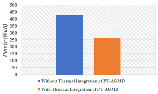 Figure 19 shows the energy consumption comparison as a result of photovoltaic thermal integration. The results showed that a 39% saving in energy consumption was afforded by the use of a photovoltaic thermal integrated membrane desalination system since the system provided electrical power to run the pump and the chiller, in addition to providing the thermal energy to heat the saline water, thus eliminating the use of a heater.