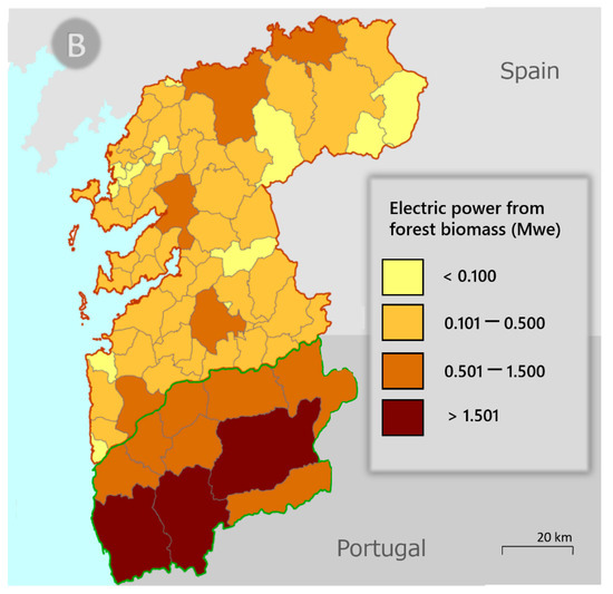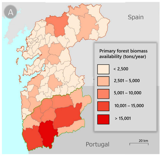 The high availability of primary biomass in the region of southern Galicia and northern Portugal has driven this initiative for the creation of a forest production value chain for bioenergy (Figure 2). Through a collaboration between forest managers and forestry companies, products such as wood chips, pellets, and briquettes are created to be used as a source of energy and/or heating at both industrial and domestic levels. The common management forests analyzed in this case study have allocated 20 hectares, divided into 5 plots, for the production of biomass [45].