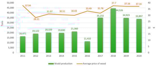 Wood production and average price per ton of wood marketed in Galicia (2011–2020).