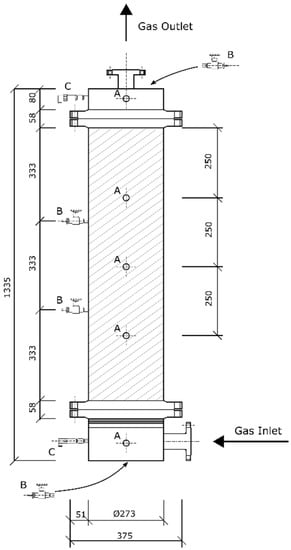 Figure 2. Diagram of the fixed-bed AC adsorber integrated with GazEla gasification installation. (A—thermocouple, B—gas sampling, C—pressure transducer).