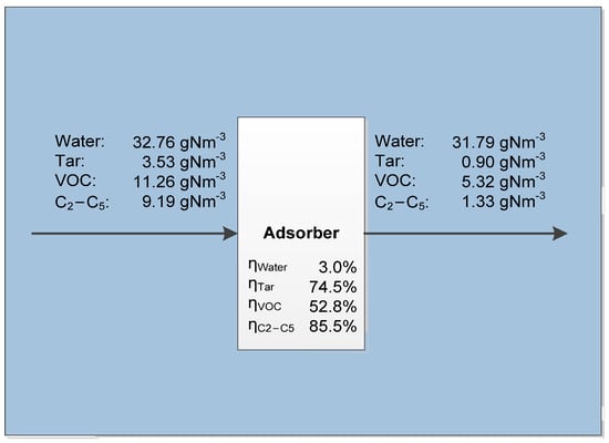 Intentionally, the adsorption test was carried out under conditions of high contamination of the producer gas. These conditions were induced by maximizing the impurities contained in the producer gas, i.e., through the use of wood chips with high moisture content and a simplified setup of the gas cleaning system.