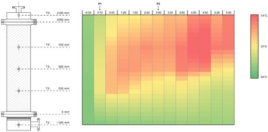 The highest temperature in the bed equaled 51.3 °C (with dT of the bed f 17.9 °C) and was measured at a bed height of 750 mm at 4 h and 50 min from the start of the experiment. This moment was also the inflexion point for the temperature rise of the bed. At this moment, the whole volume of the reactor attained a pseudo-steady state, hence theoretically the efficiency of the gas cleaning reached zero.